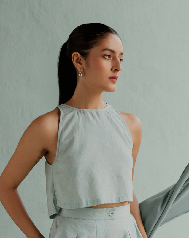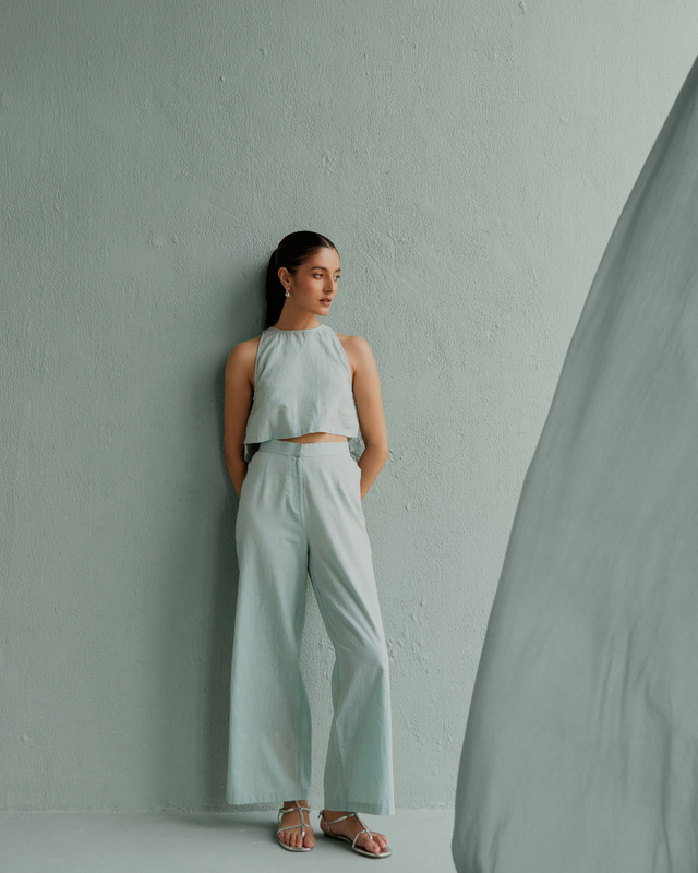 This trendy stunner is sure to turn some heads - a chic crop top and matching bottoms in a soothing, sage green colour. Minimal, light-weight and airy: it’s got all the comfort with no compromise on style.