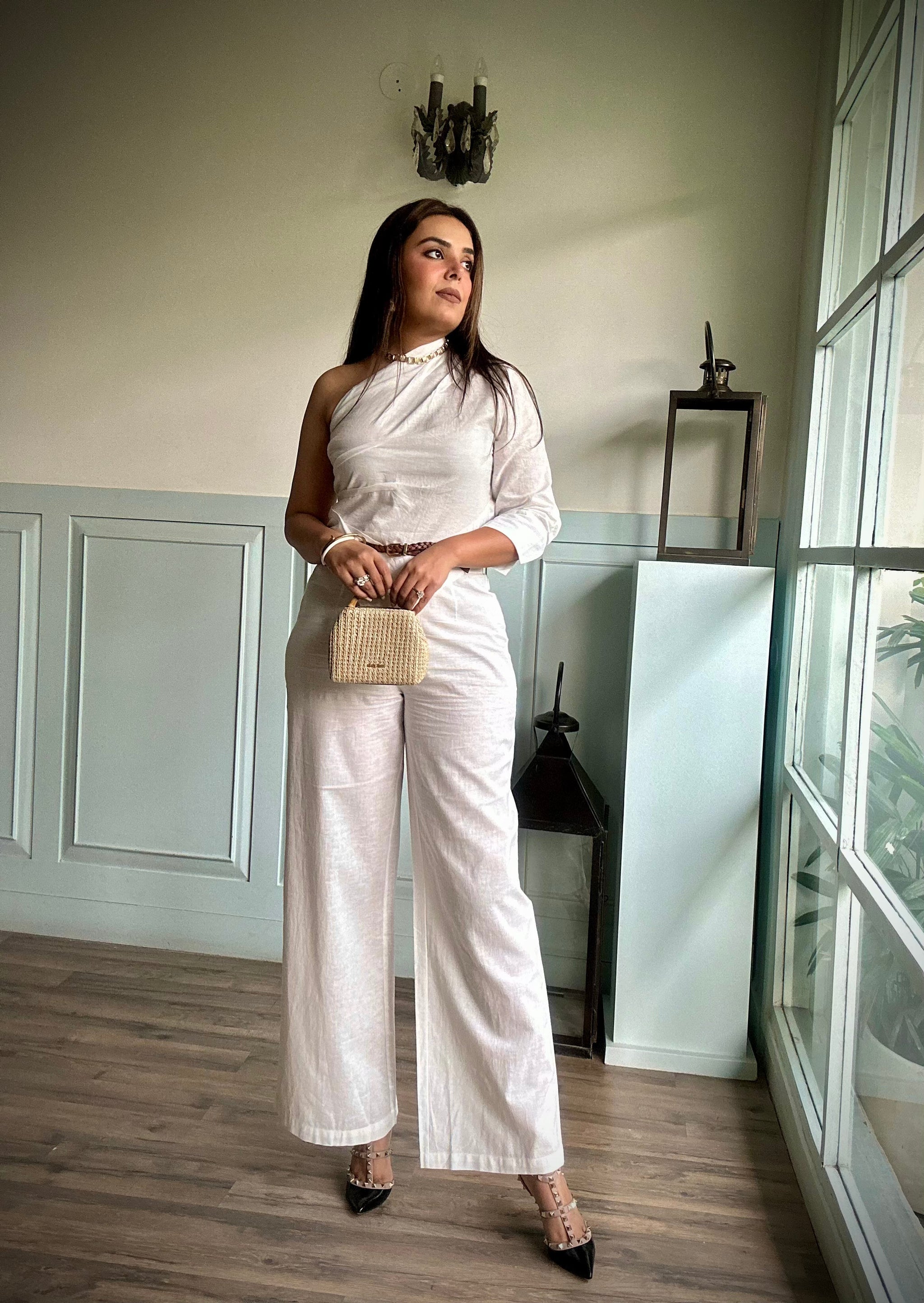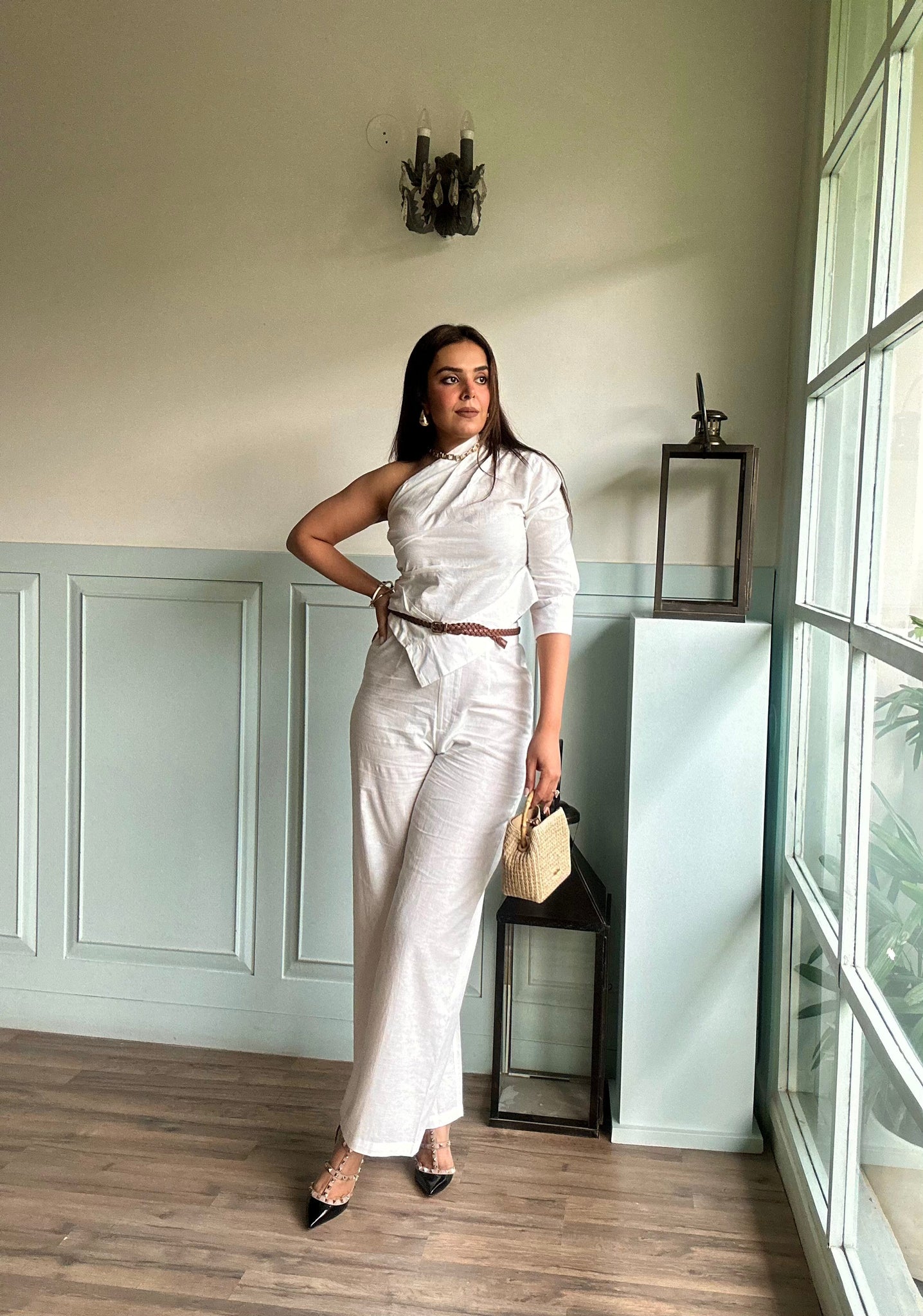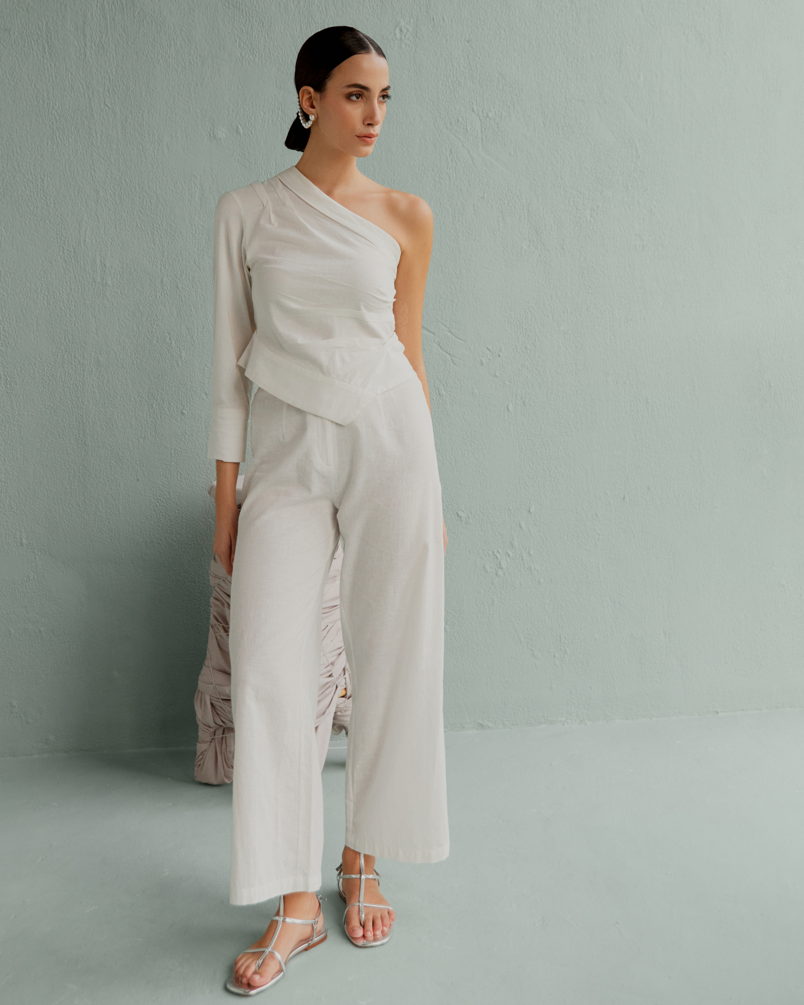 Playful and classy, rolled into one set! With an off-shoulder and asymmetric cut top and full length classic pants made with breathable fabric, this ensemble is a must-have for every season.