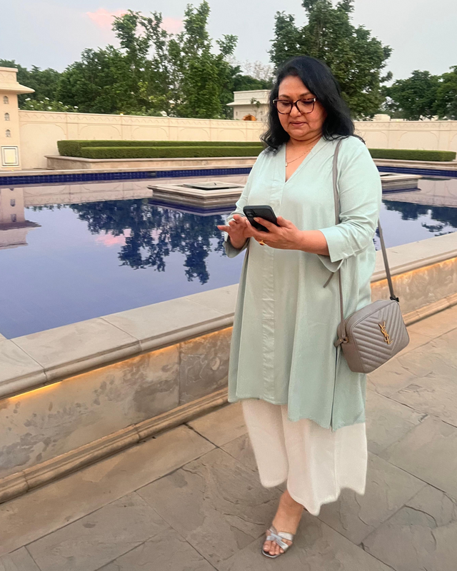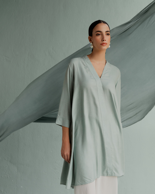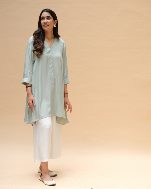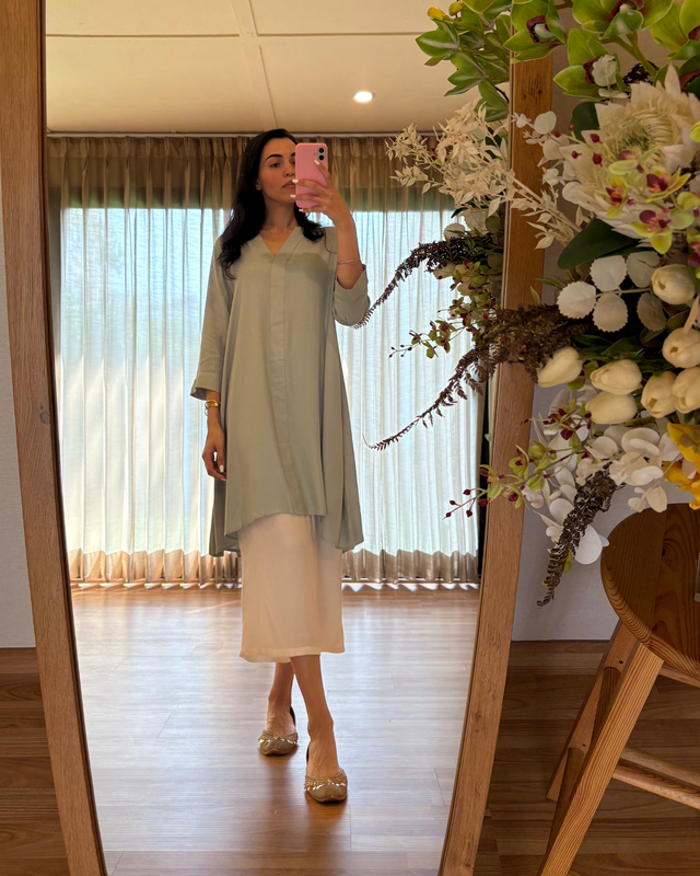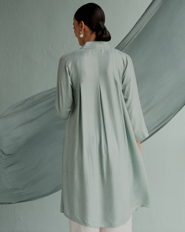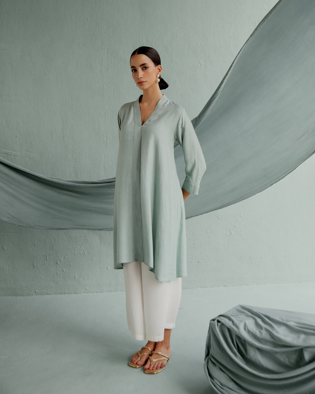 Giving your typical Indian kurta set a modern twist, this set redefines classic elegance with stylish back pleats for a touch of elegance. Paired with straight-fit moss bottoms, it combines traditional elements with contemporary flair.